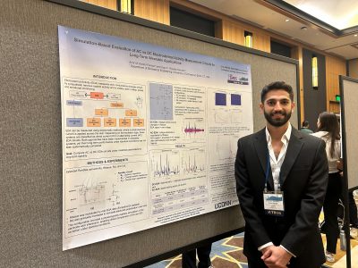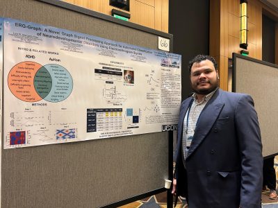 Fourth year PhD student Luis Mercado Diaz and Amir Karimi Forood headed to Los Angles for this years International Conference on Biomedical and Health Informatics. Luis presenting work on ERG Graph Classification methods for diagnostic applications while Amir debuted simulation based evaluation of AC vs. DC Electrodermal Activity circuits.